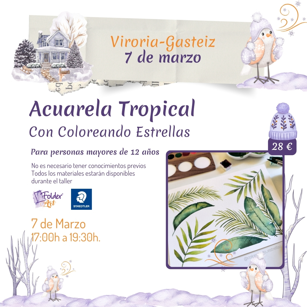 Viaja al trópico a través de los pinceles. Aprenderemos a crear hojas y motivos exóticos con técnicas de acuarela, guiadas por Coloreando Estrellas. Todos los materiales están incluidos, ¡tú solo trae tu creatividad!.